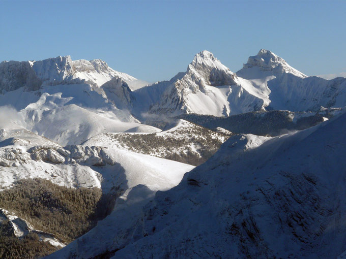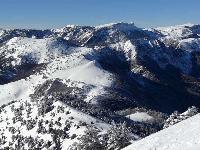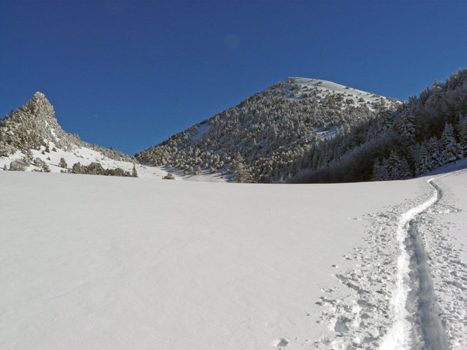 neige extrèmement dense ayant bien adhéré sur l'herbe (en sud) ou la neige glacée en nord et ouest, sauf quelques zones dégarnies sur la croupe. L'enneigement est au moins égal à celui observé en Chartreuse, encore 50 cm après un jour de tassement. On devait bien avoir les 60-80 cm annoncés par MF pour le Dévoluy.
