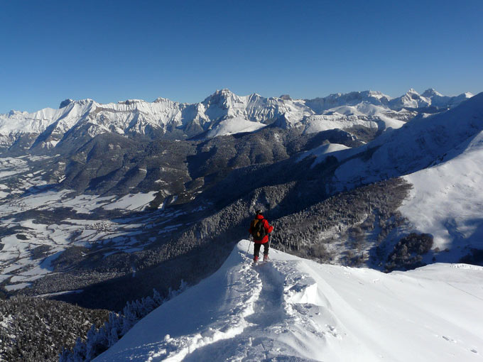 Equation pas simple du jour. 1. Trop beau pour pas bouger et un nouvel apn à tester ; 2. Gaffe à la nivo ; 3. Dimanche : éviter les routes saturées. Pour le dernier point pas de pb, la route de Prayet à Menée est en bonne neige damée, les murs sont formés, presque personne, on peut se lâcher. A skis c'est pas la même. Neige épouvantable à tracer - merci à mes prédécesseurs - à skier et même à surfer au dire d'un spécialiste croisé sur la croupe. La raquette n'était sans doute pas le plus mauvais instrument. Du coup un petit Barral m'a suffi.
