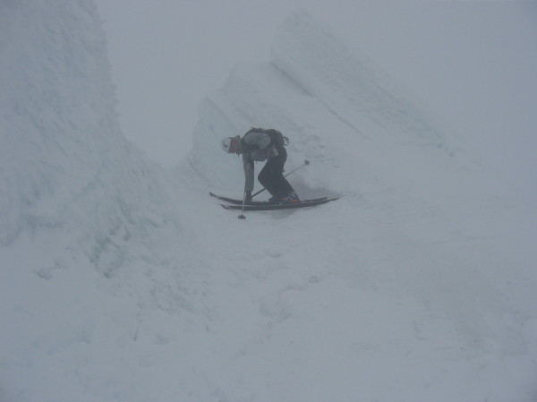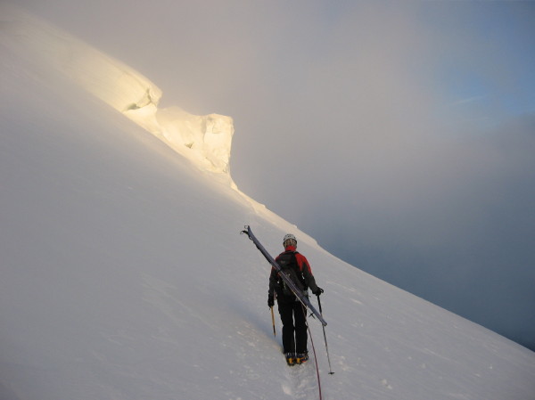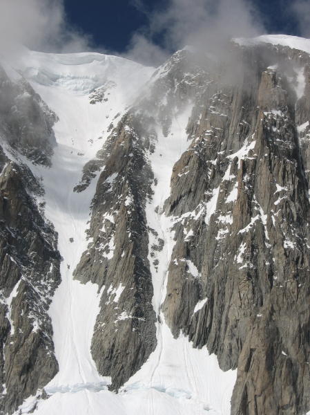 Partis sous un ciel étoilé pour attendre tranquilement que les premiers rayons du soleil tranforment le couloir Gervasutti, ce sont finalement des cumulus avec visi à 3m , vent et grésil qui nous acceuillent au sommet du tacul: on se caille=> cassos. Vers 8h00 ça se dégage et on est au pied du tacul: on hésite à remonter car en avoinant un peu c'est encore jouable vu que le regel est meilleur que la veille mais reste l'incertitude que les cumulus reviennent vu l'instabilité mto de ces jours ci. Finalement ca ne se recouvrira qu'en milieu d'AM...Tant pis on reviendra...A noter qu'avec la chaleur de ces jours ci l'étroiture du 1/3 inférieur ne doit plus être terrible. Bref, vaut mieux oublier les pentes raides du coin pour un petit moment quelle que soit l'orientation. La face N du Mont Blanc semble être le meilleur plan actuel mais jonction bien ouverte avec portage pour rejoindre le plan de l'aiguille.