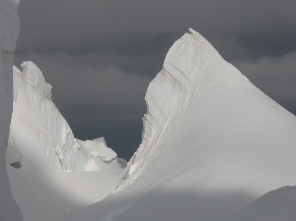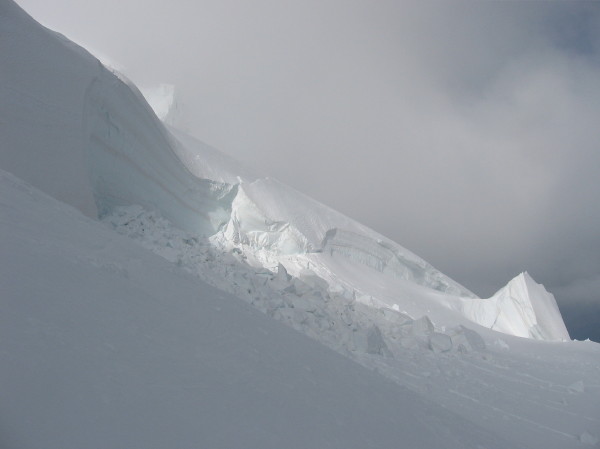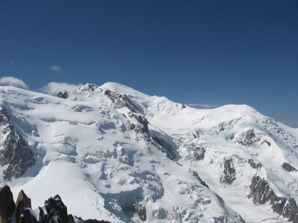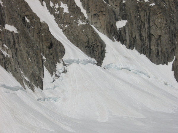 Plus de neige froide jusqu'au sommet du tacul: croûte transfo béton avec un peu de grésil de la veille. Pas de glace et ponts de neige encore solides mais de belles crevasses en perspective dans quelques jours. Une traversée expo sous un sérac menaçant. Bas des couloirs des cosmiques et du glacier rond ravagés, de même que la face N de l'aiguille