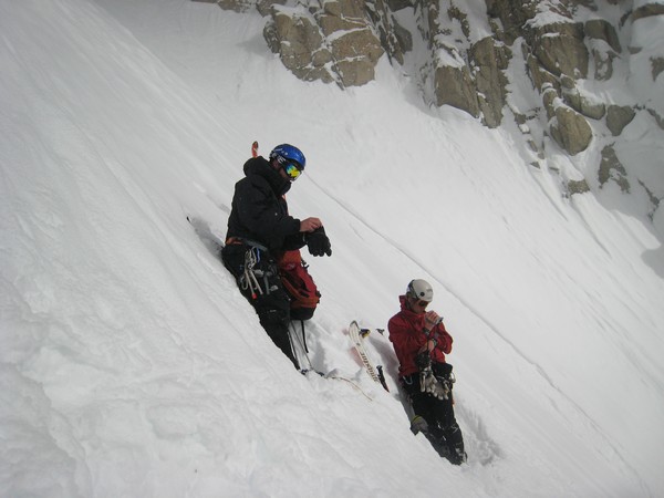 On s'est fait la main le jour précédent dans les couloirs Nord du l'aiguille du midi (glacier Rond et couloir des Cosmiques) , le remplissage n'est pas bon pour un début mai! La neige y était bonne , mais les nombreux passages ont vite dégradé la situation!