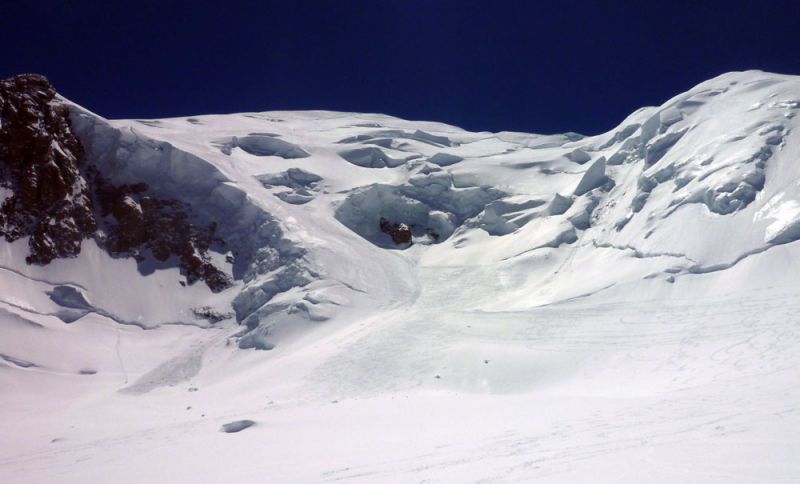 Neige stable hormis tout en bas (<2300m) ou des coulées de lourde partent facilement sous les skis. Par contre, belle frayeur avec un gros serac s'effondrant vers 3500m sur la voie de descente une minute après notre passage.