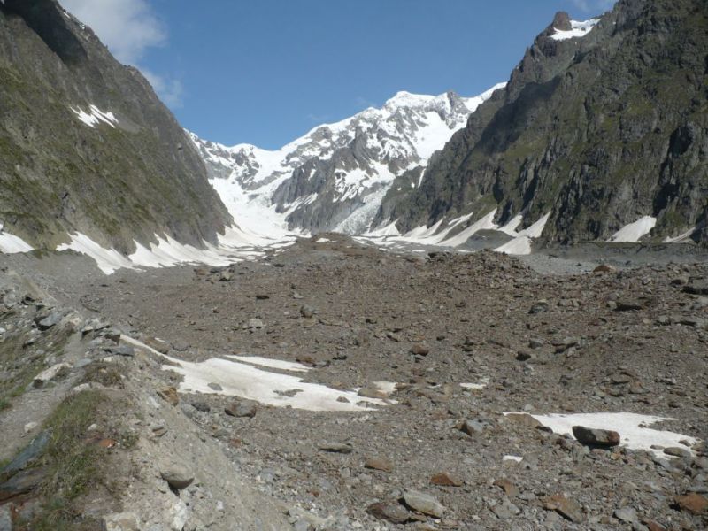 Cantine de la Visaille (1635 m), route jusqu'au lac de Combal, sentier, moraine, glacier du Miage, vires pour accéder au refuge Gonella.