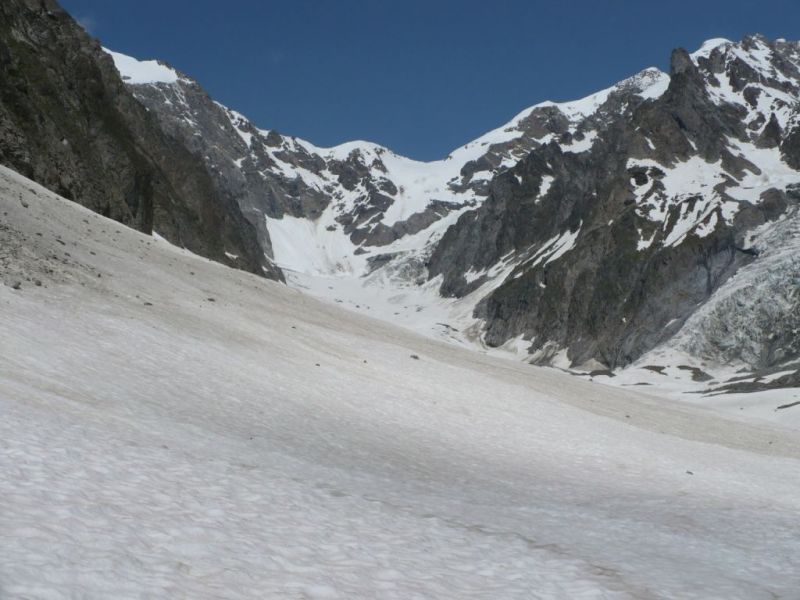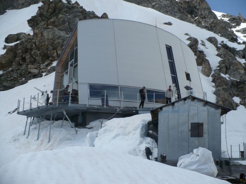 On skie à partir de 2100 m jusqu'à 2600 m sur une neige de névé, puis accès à pieds jusqu'au refuge. D+ : 1400