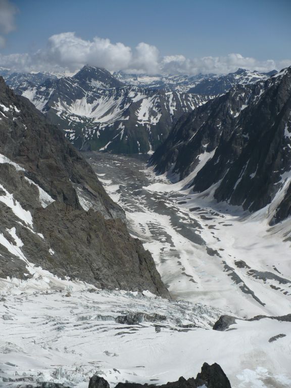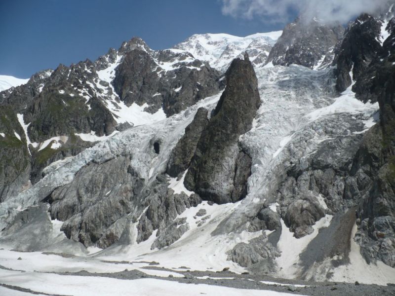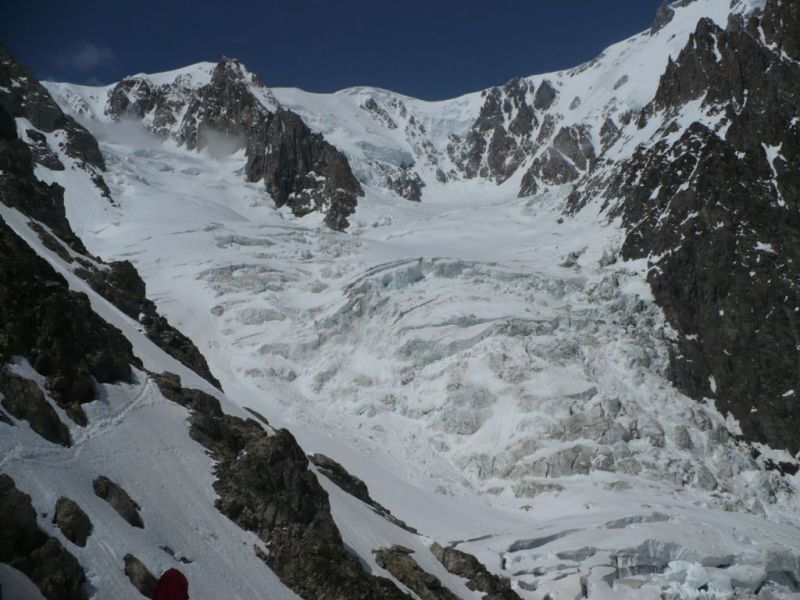 Journée d'approche en Val Véni pour monter au refuge de Gonella, tout neuf, pour faire le Mont Blanc le lendemain par le Piton des Italiens. L'accès au refuge se fait par des vires équipées à l'italienne, type via ferrata (échelles, chaînes et cordes). Stéfano et son équipe ont accueilli ce jour, une trentaine de personnes cosmopolites (allemands, suisses, français, et bien sûr italiens) dans un cadre sauvage face à la nord de Tré la tête et de son glacier suspendu. Nous étions les seuls à monter les skis devant les yeux ébahis des alpinistes.