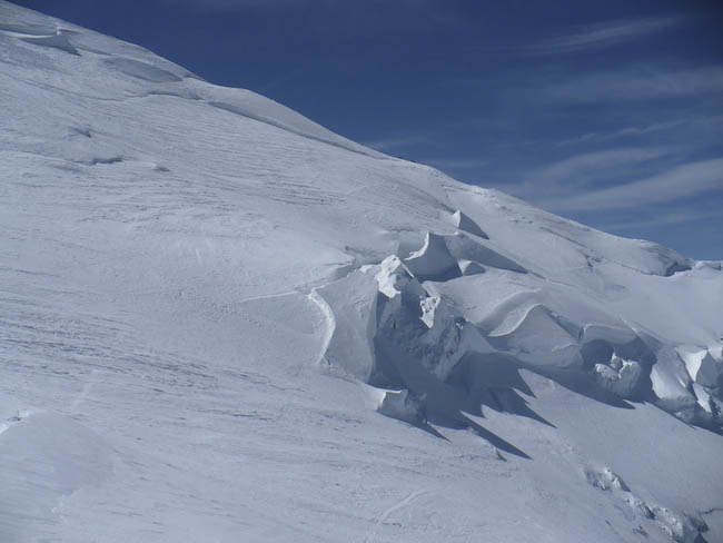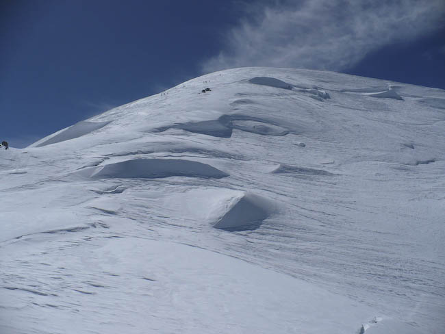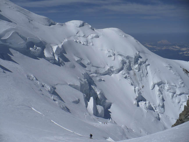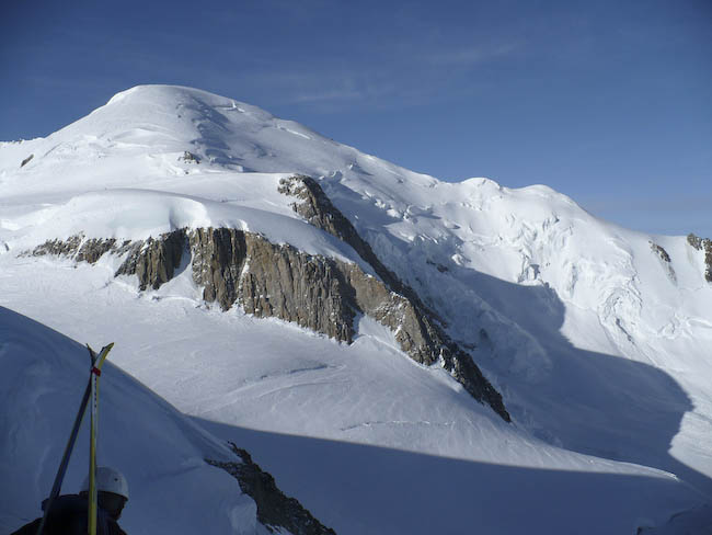 2500 m de descente à skis non stop. Course très esthétique. Paysage magnifique spécial Mont Blanc. Dès 3h du mat, les classiques allant au Mt Blanc s'illuminent. Une soixantaine de personnes ont défilé aujoud'hui sur ce sommet avec une bonne répartition.