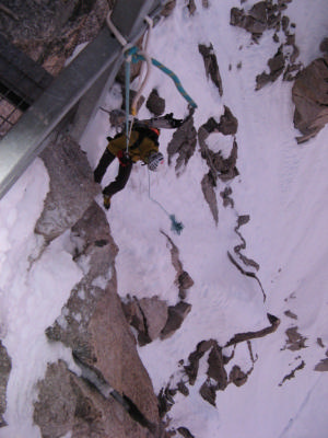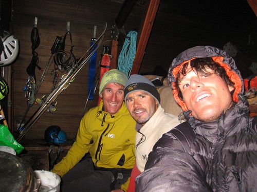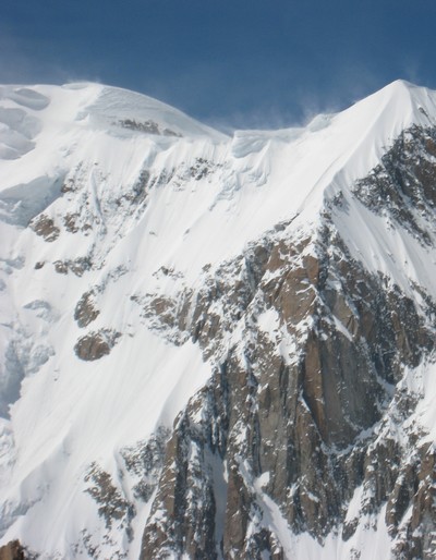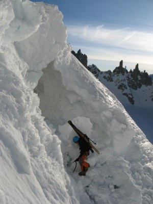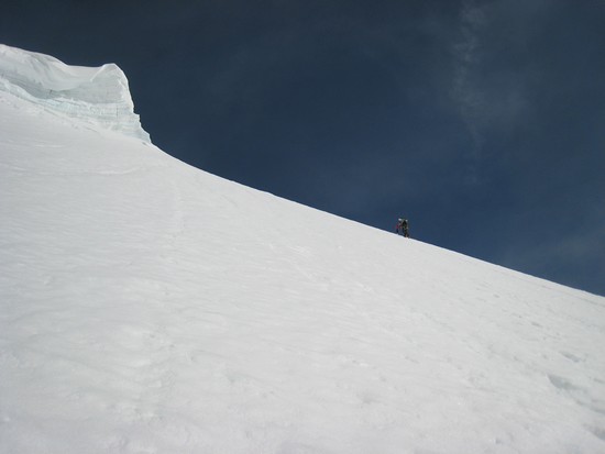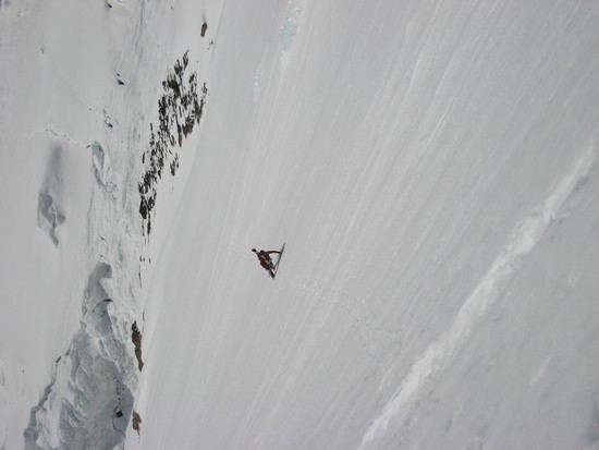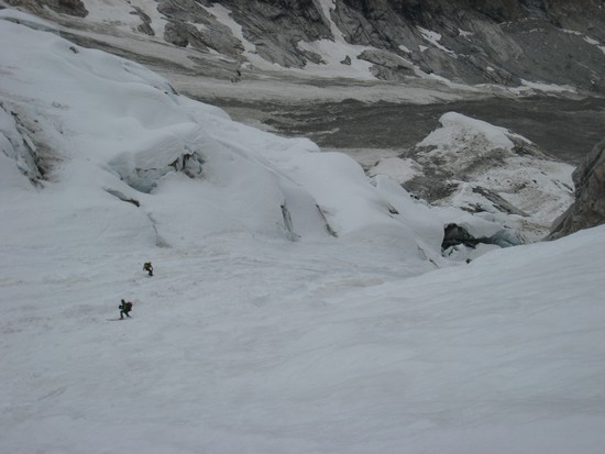 Le vent et les voiles ont empêché l'objectif de decailler, ce qui n'est pas le cas du glacier de la Brenva : neige complètement pourrie (faut dire qu'une face Sud à 17H c'est jamais très bon!)