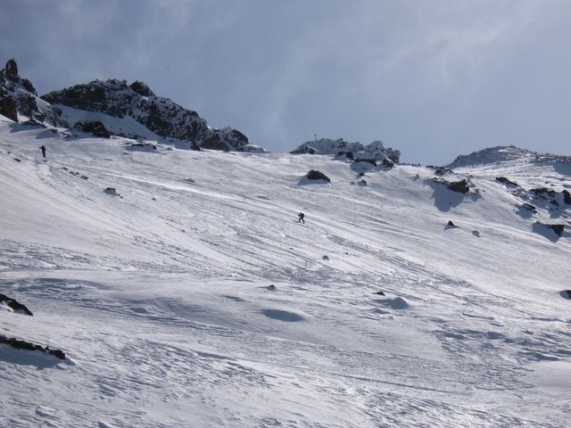 Aucune instabilité. Le fond est dur et la couche posée dessus, quand il y en a, n'a pas une grosse épaisseur. Pas ou peu de zones d'accumulation, sans doute au fait de l'exposition Ouest du versant et au travail du soleil de ces dernières heures. Idem en Nord, c'est du dur ou crouté et quand c'est mou ... peu d'épaisseur. Retour bagnole par la Pérousaz.