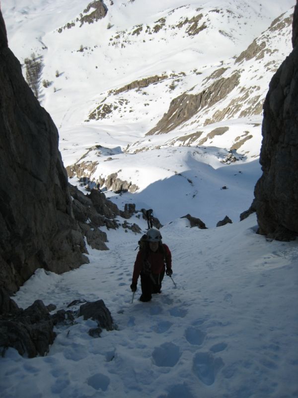 Suivre le chemin des Baisses puis continuer dans le vallon rive droite jusque vers le télésiège du rocher Rouge. De là repérer l'itinéraire qui en bas permet de franchir la partie rocheuse. Soit celui décrit dans Ripido, une goulotte impraticable ce jour, soit plus à gauche, un couloir oblique droite/gauche de 100 m de D+ env., encaissé et que l'on atteint en faisant un petit crochet suivi d'une traversée.