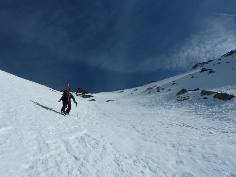 Les pentes ouest toujours pas transformées ce qui donne une remontée bien fastidieuse, l'enfoncement allant parfois jusqu'au-dessus du genou... Ce n'est qu'en sud qu'on trouve de la vraie transfo sur fond dur. Et en nord de la vielle poudre mais comme l'enneigement est faible, cette vieille poudre cache surtout les cailloux.