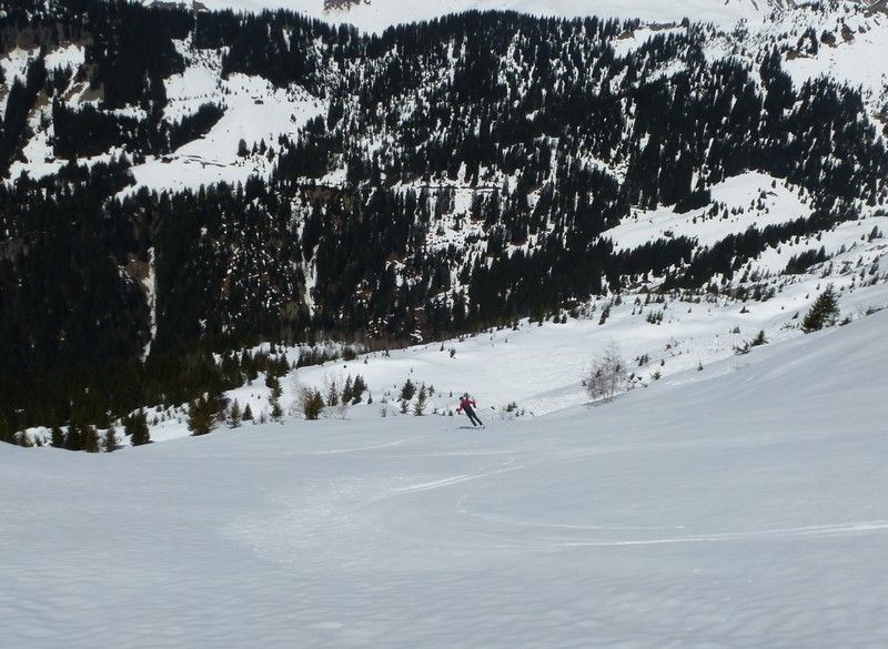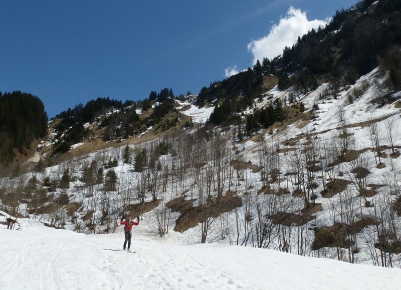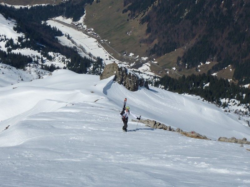 Petit détour à la montée vers les chalets du Planet (la forêt oblige à un peu de portage). Nous sommes ensuite montés un peu haut ce qui nous a obligé à une redescende pour prendre pied dans la face. Descente directe sur le parking ensuite, moyennant 2 passages secs de 10 mètres on arrive à quelques dizaines de mètres de la voiture.