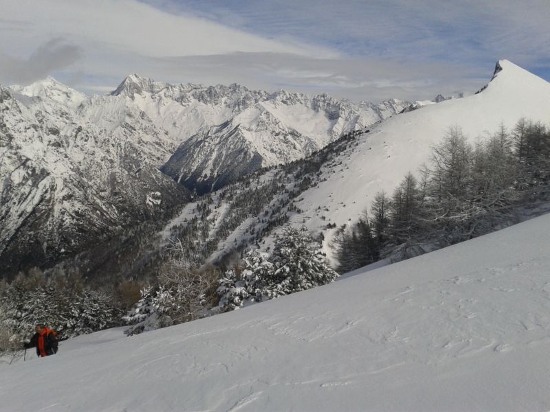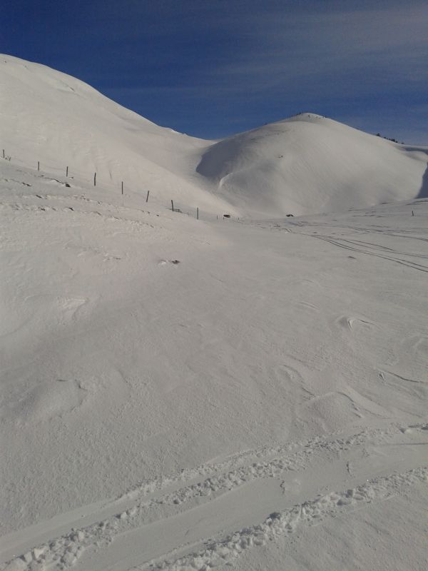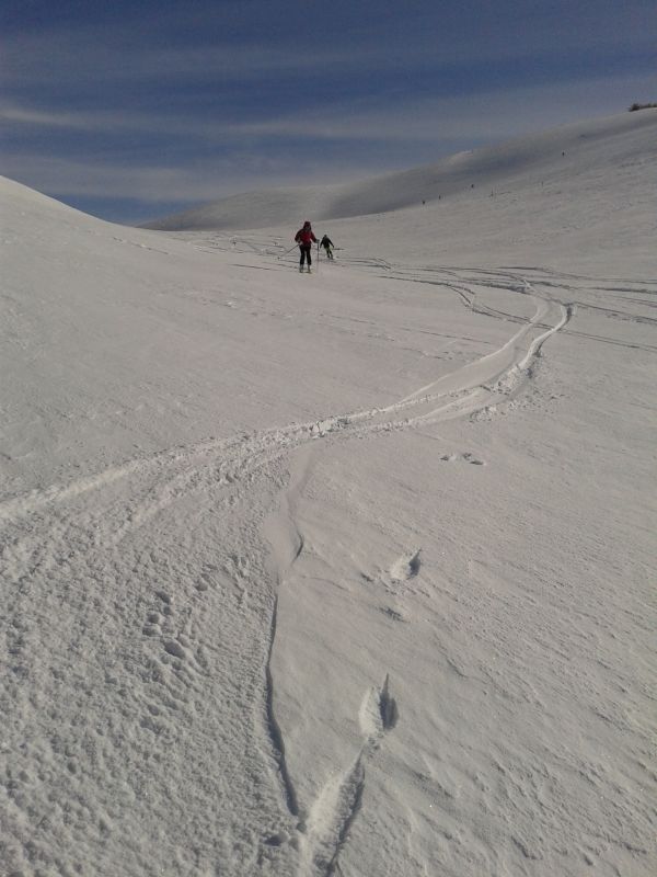 Je suis déjà allé deux fois dans le coin, à chaque fois neige pas terrible (ou pas assez), vent... bref je suis parti un peu à reculons... Comme quoi il faut persévérer ! Neige super bonne dans toute les descentes, quelques endroits soufflés à proximité des crêtes mais ça n'a rien enlevé au plaisir de skier et de pouvoir se lacher. On a fait une petite incursion dans la face nord de Côte Belle, superbe neige légère, mais on a pas poussé bien loin. Quand les conditions sont comme ça ça vaut vraiment le coup de tricoter dans le coin, il y a moyen de faire du dénivelé en ayant de la bonne neige !