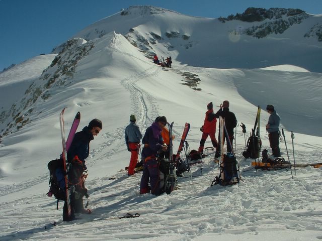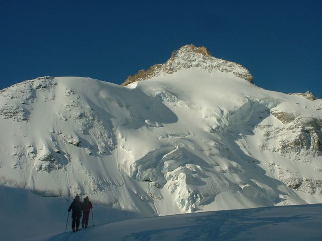 Depuis la cabane du Mountet atteint la veille, traverser par une grande oblique pour remonter au travers des diverses zones de crevasses (bien visibles) le glacier Durand et rejoindre le col après passage de la rimaye, par une remontée raide (>40°). Suivre l'arete du Mont. Stop ski à 3565 m au pied de l'arete rocheuse du Mont.