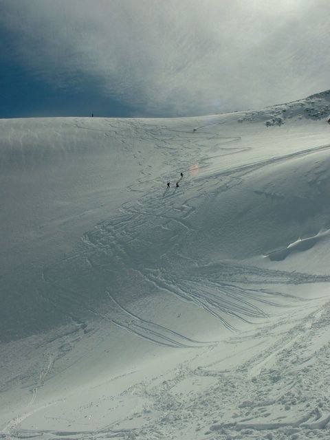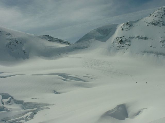 RAS une soirée douteuse avec un plafond bas et bouché ==> un réveil avec une couche de poudre et un temps superbe. Zones de crevasses parfaitement visibles.