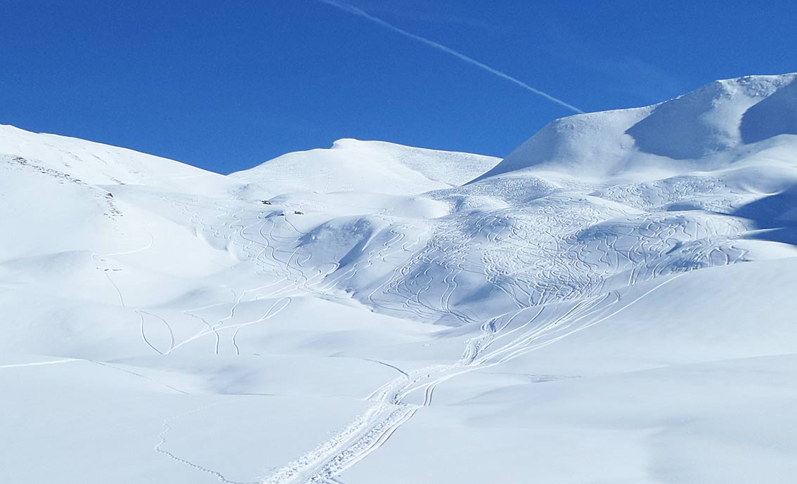 Que c'est vaste. Après 10 jours pratiquement sans chutes de neige et de très nombreux passages il y a encore beaucoup de place pour tracer. Ouf le Plan Neige, obnubilé par les stations d'altitude, était passé à côté de cette merveille. (Voir commentaire VAN/C12 page 107)