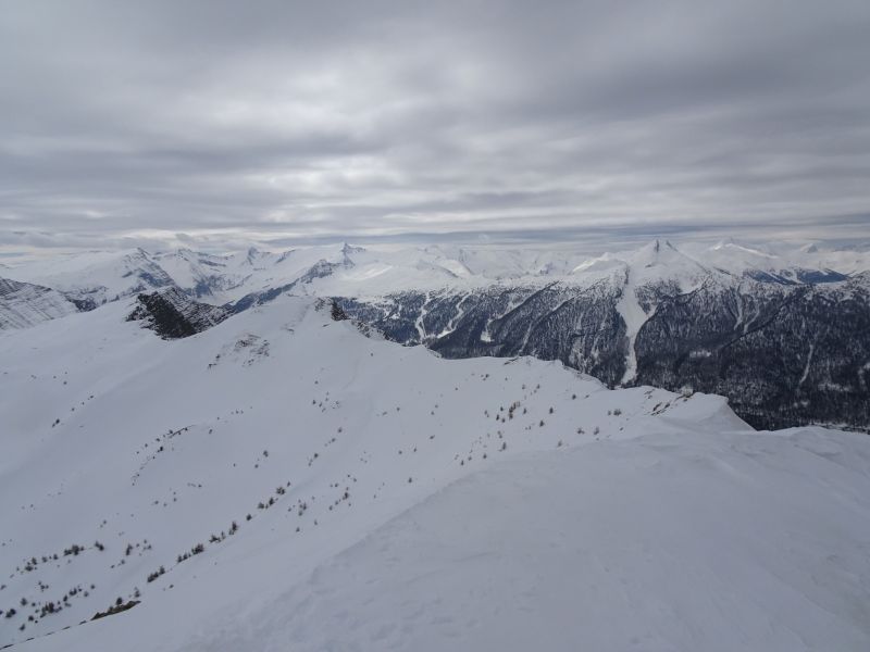 J2.2. J'ai suivi une trace d'hier par flemme. Elle s'arrête sous le ressaut du sommet 2496. Bilan 200m de redescente pour rejoindre la voie classique, car trop raide pour traverser dans ces conditions. J'avais prévu de traverser sur Pra Mouton mais le jour blanc est trop pénible en terrain dégagé donc boucle dans les combes de Pra Leydon.