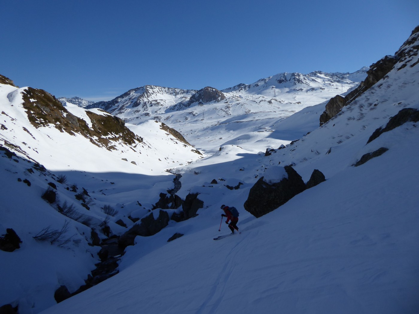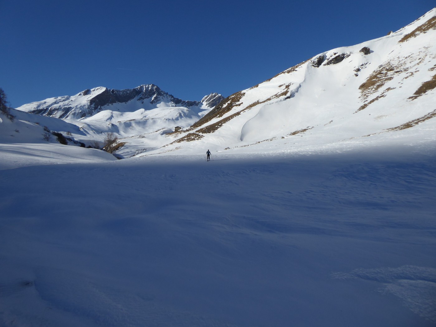 Montée par la combe entre le grand Berrier et le Laityre. Descente par celle à l'ouest du grand Berrier. Du fond du vallon, nous sommes remontés à la cantine des Eaux Rousses (D+100) pour rejoindre les pistes de la Thuile.