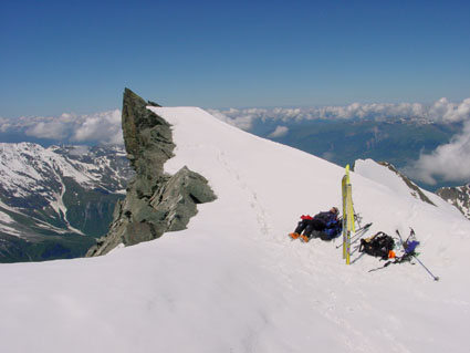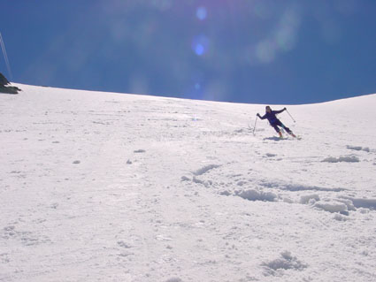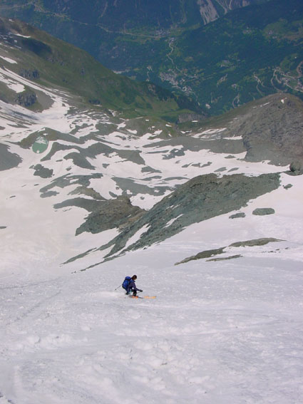 Après le Dôme des Ecrins je voulais terminer la saison par le mont Blanc, mais c'était surbooké. Pas mécontente de rattraper le coup par une pente raide. On avait pensé enchaîner par le Pourri, mais ça ne marche qu'en neige froide. En neige de printemps les deux faces (Pourri et Turia) dégèlent à la même heure. Du coup on a fait une monstre sieste en haut de Turia dans un petit berceau de neige entre les rochers et une corniche. Pendant que je dormais (excellent pour l'acclimatation parait-il, je pars au Chili) mon vaillant papounet a descendu une première fois le haut de la face nord pour en vérifier les conditions. A la descente, (c'était la première fois que je faisais une pente comme celle-là, surtout qu'on ne l'avait pas remontée), j'ai trouvé plus facile le haut en neige dure que la partie médiane pourrie. Parait que c'est limite entre 4.3 et 5.1. De toute façon c'est plus que mon précédent "record" de ces deux dernères années (face nord du Colon en poudre=4.1). Bonne fin de saison à tous ceux qui continuent et à l'année prochaine. Ciao