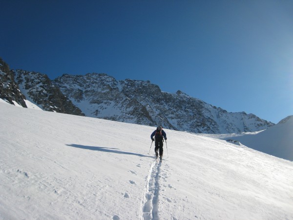 Piste de ski de Super Saint Bernard. remontée des combes soutenus jusqu'au pied du couloir. Emprunté la branche de droite qui sort au niveau du couloir central.Montée au sommet.