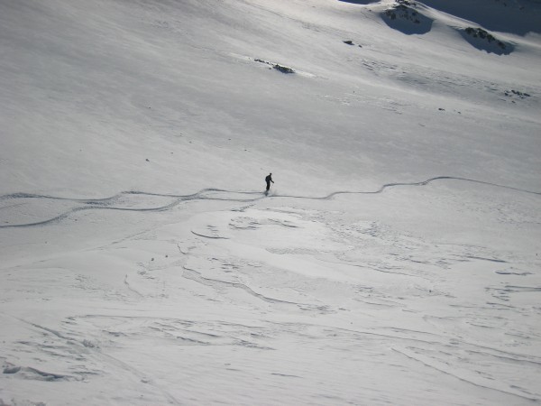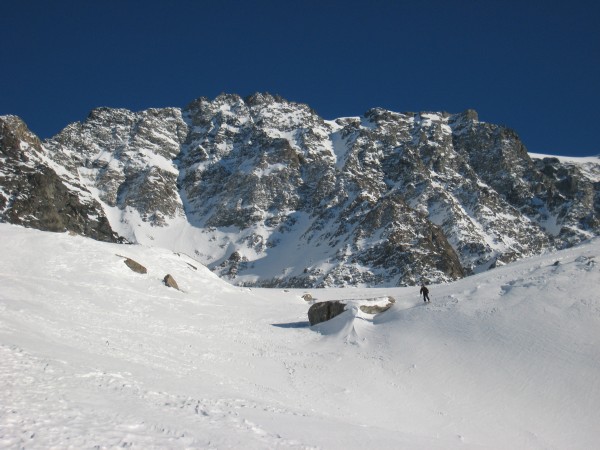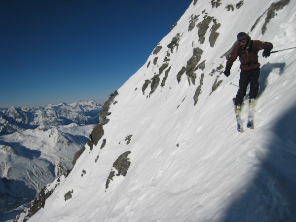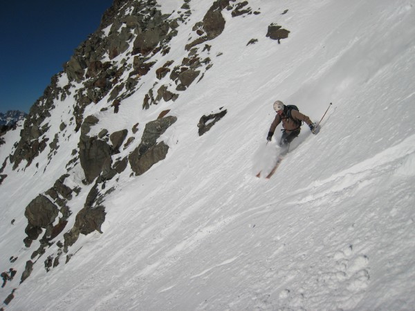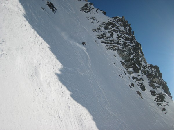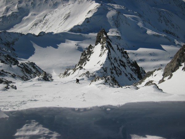 Magnifique secteur avec une vue imprenable sur l'envers du massif du Mont Blanc. Dépaysement assuré! Le couloir est large , long (600m), très skiant et relativement soutenu (40-45 et 100m à 50). Les conditions de neige sont très bonnes , excellente surprise! Vielle poudre dans le couloir et en skiant dans les combes.Encore merci à Lolo pour l'idée!
