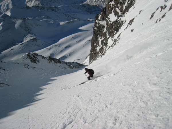 Bon remplissage du couloir et neige excellente dans 90% du couloir , poudre dense. Une accu douteuse dans le ressaut raide de la branche de droite, skié à la descente.