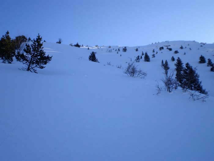 Par risque 3 en restant sous 1800 m, même en versant froid, on ne prend pas trop de risques, vu que les pentes sont inclinées entre 30 et 35°. Mais il ne faut pas sous-estimer ces pentes, qui m'ont fait une fois rebrousser chemin. Il faut aussi garder à l'esprit qu'on est ici, dans les pentes supérieures, sur des dalles rocheuses assez lisses. Plusieurs ravins et de petites barres sont aussi là pour former des cassures. Deux passages en orientation nord-ouest vers 1700-1750, surmontés de pentes soufflées assez raides, m'ont fait hésiter un peu, mais la trace de mon prédécesseur m'a inspiré confiance.