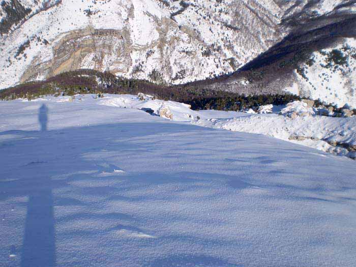 Je ne m'attendais pas à trouver une trace sur cet itinéraire, assez confidentiel. Et pourtant, une belle, sans doute de la veille, m'a mené au sommet. Que l'auteur en soit remercié. J'ai trouvé la neige très agréable à skier, mais cela ne sera pas obligatoirement le cas pour tous, car des skis larges, type free ride, sont conseillés pour apprivoiser la couche supérieure finement croûtée. Si on parvient à conduire ses courbes, c'est très bon, du sommet jusque dans la forêt vers 1300. Après, on glisse agréablement jusqu'à la voiture, mais c'est juste pour rentrer.