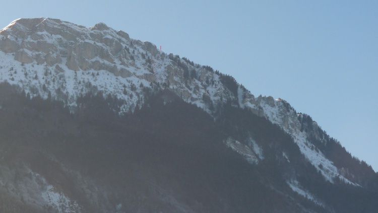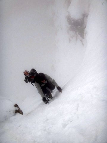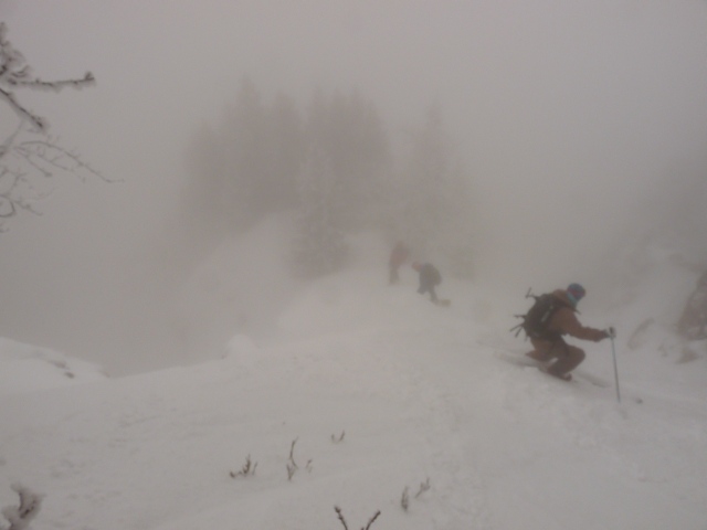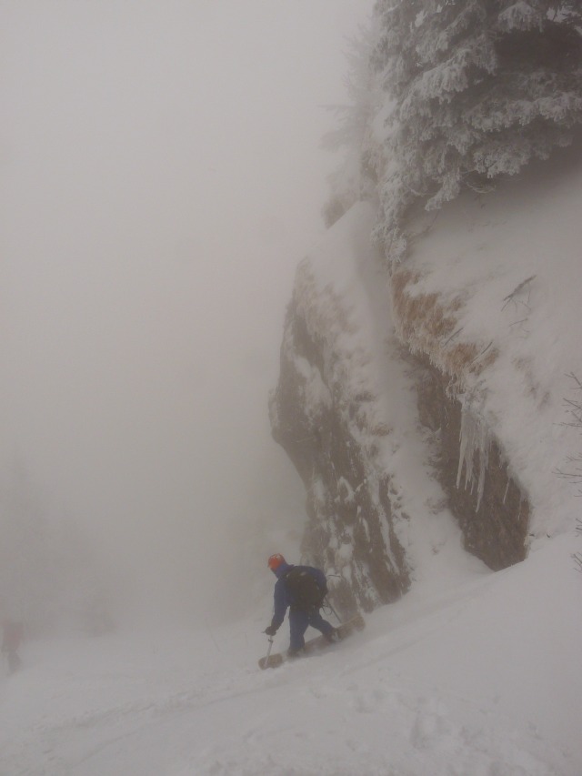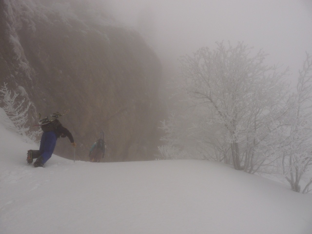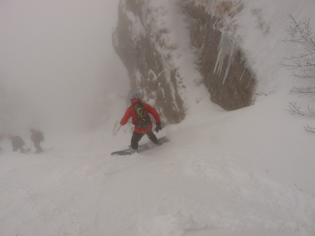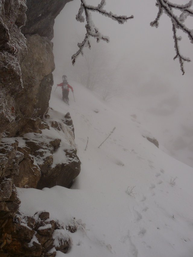 Une façon sympa et plus alpine pour grimper à la Pale. Environ 500 m de pente soutenue avec des passages bien raides, dont un qui nous a donné bien du fil à retordre. Globalement les 5 cm de poudre reposaient sur une surface accrocheuse et ça descendait bien. Mais dans la partie la plus raide, c'était béton et rien n'a tenu dessus. Seul Thibaud a skié le couloir intégralement dans une décontraction déconcertante ! Les 3 surfeurs se sont mis ''taquet'' même armés des piolets. Pas moyen de déraper surf aux pieds...après s'être retrouvé juste accroché aux piolets sans appui carre il a fallu se résoudre à rechausser les crampons pour 50 m. Joël a tenté sa chance dans une branche parallèle mais avec un déchaussage aussi pour passer une barre mal enneigée. Sous ce ressaut on a retrouvé une surface avec du grip et les surfeurs se sont détendus.