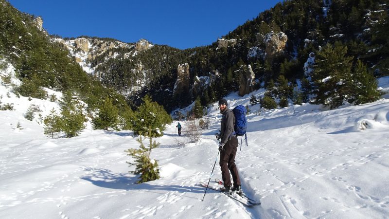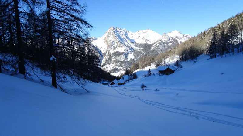 Traversée Ceillac Pont de Bramousse. Montée par le ravin des Aiguillettes, la combe de Bramousse pour atteindre le plateau 2326 et skier le sillon nord sur les chalets de Bramousse.