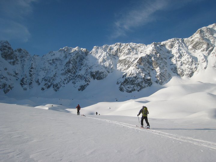 Beaucoup de monde aux Agneaux ce jour de Paques, des italiens , des skitouriens , et une équipe de tournage... Superbe itinéraire que ce Piaget. Beaucoup de gaz dans les virages sur la calotte. La directe Nord Ouest est étroite et soutenu (50° sur 200m), cotation 5.3?.