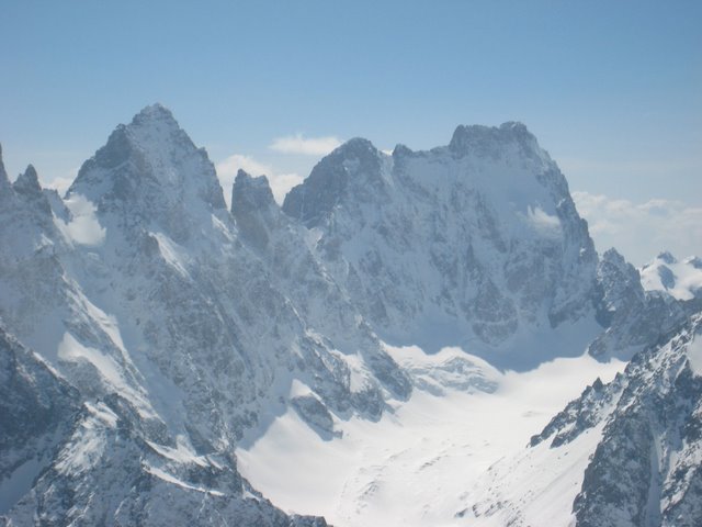 Traversée du Glacier d'Arsine, Piaget + calotte et sommet . Descente du Piaget jusque 2950m et remontée pour skier la directe Nord Ouest (descendu qques minutes plus tôt par l'équipe de tournage et les telemarkeurs).