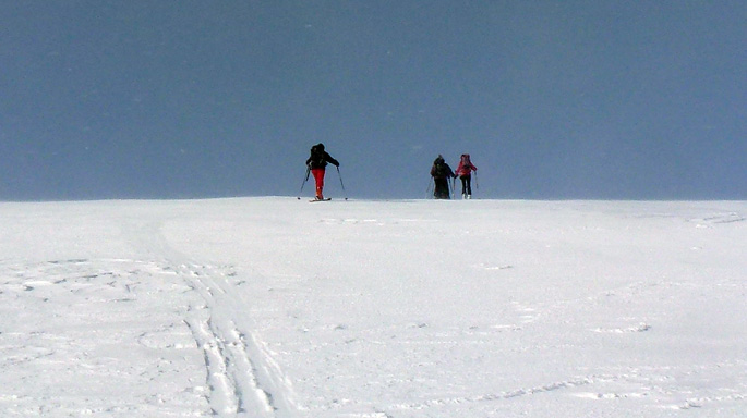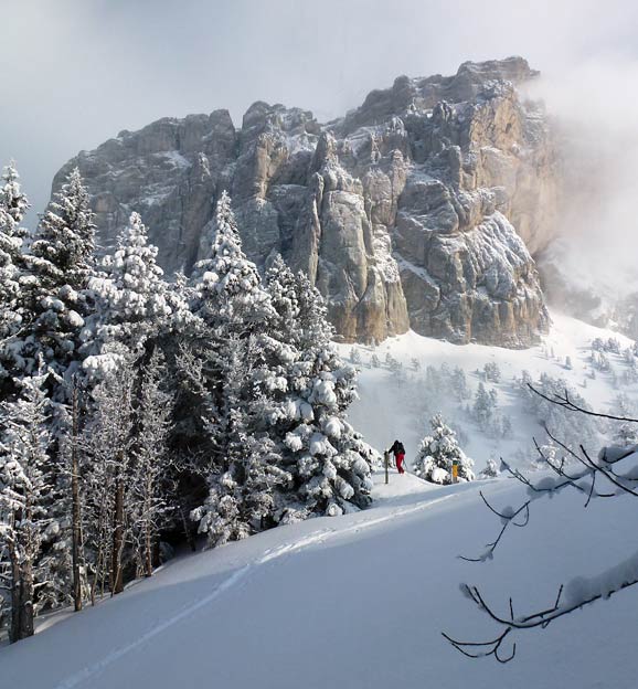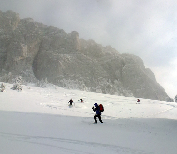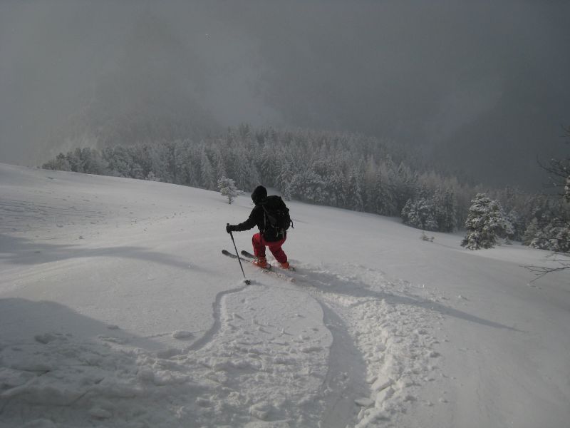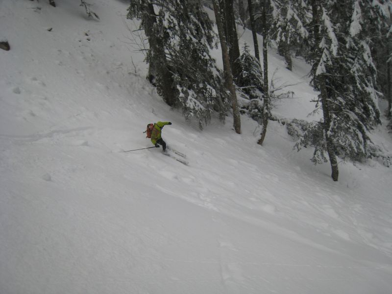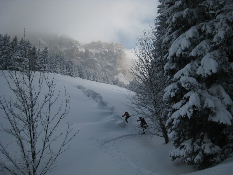Quand la poudre est si légère, skier des itinéraires peu raides est un régal. Combe du pas de la Selle en neige très légère, fond regelé tendre jusqu'au plateau. Descente de l'arête du mont aiguille en forêt, plus raide que la précédente mais le fond regelé est assez tendre aussi.