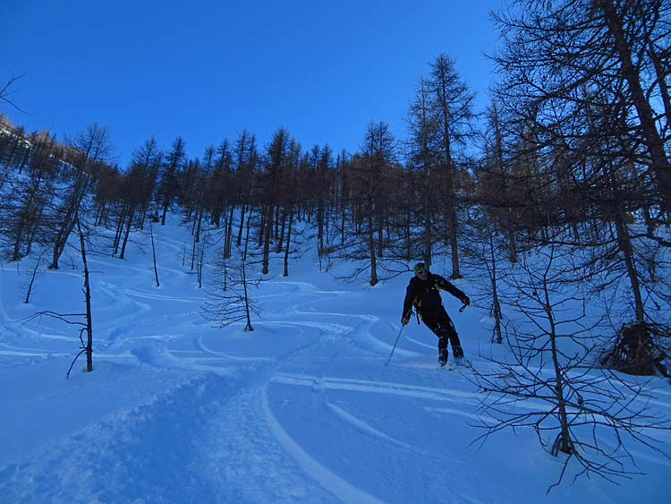 Session mélèze de l'après midi terrible avec un retour poudreux jusqu'à Chialvetta débusqué par Etienne.