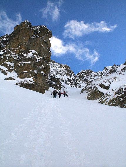Partis dans le val Montjoie pour trouver le beau temps, ce joli couloir bien encaissé dans moitié haute nous tape dans l??il.