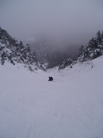 A l?origine on voulait descendre la face est mais les nuages du petit matin nous en ont privé (un brève éclaircie nous a permis de voir la face qui avait l?air en conditions puis ça s?est refermé). On s?est donc rabattu sur le couloir des 3 Pucelles, belle ambiance, les 50 derniers mètres en bas sont toujours plein de cailloux (on est passé en déchaussant).