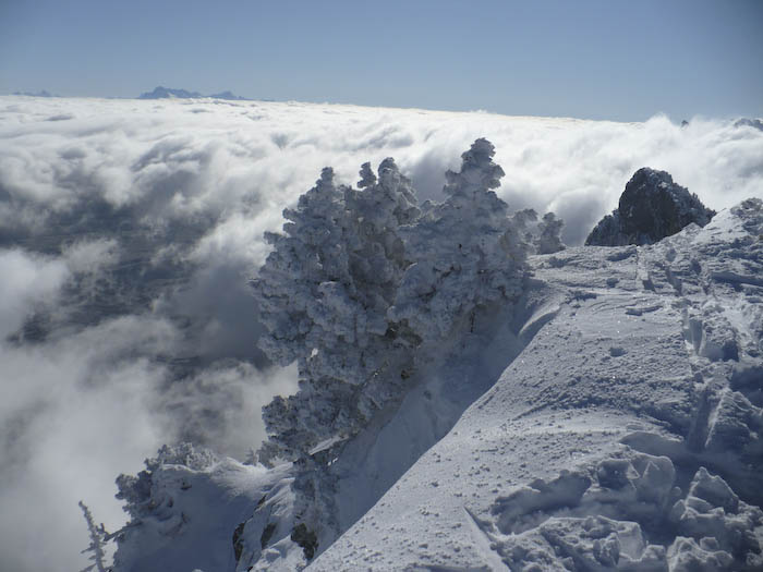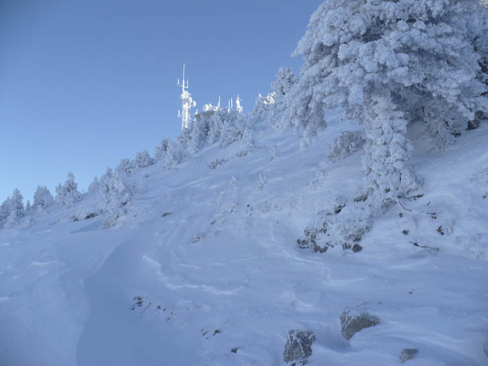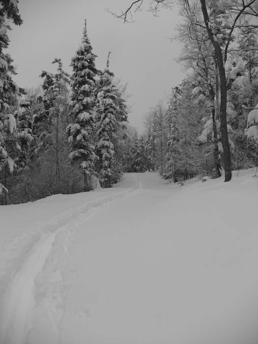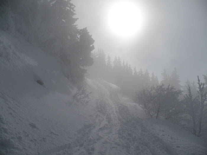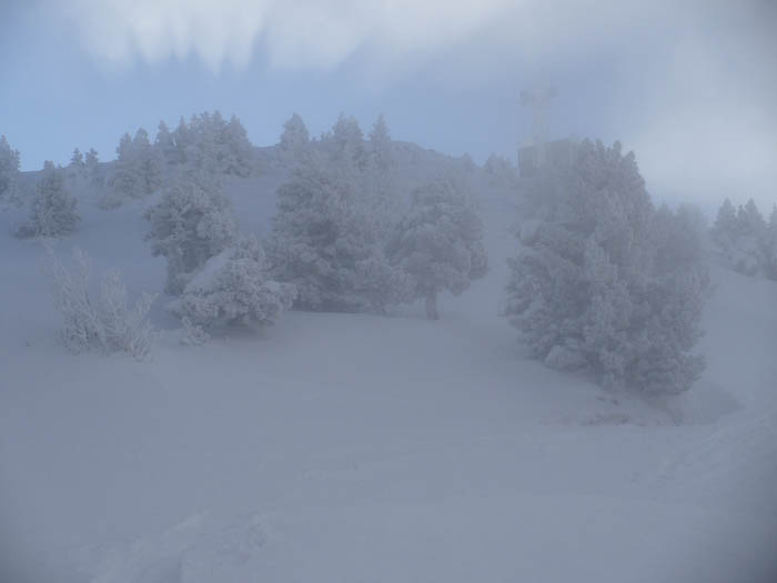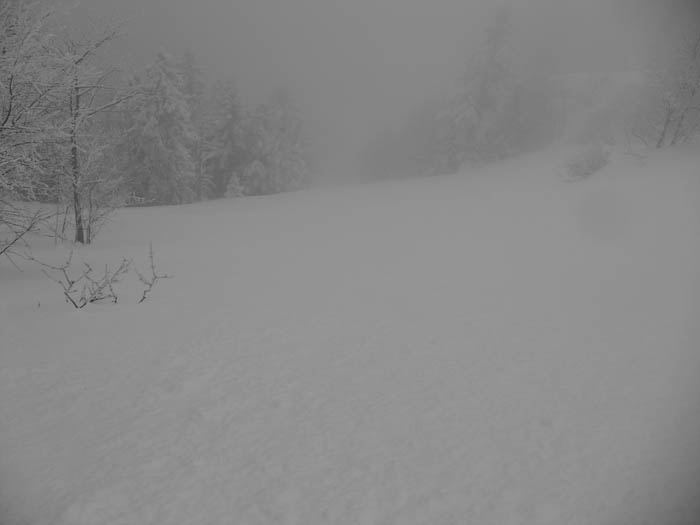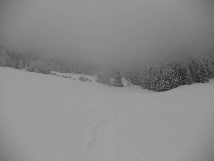 Dans la VN, la neige commence à se tasser par le passage ininterrompu des skieurs et des raqueteurs. Dans le couloir S/O, poudre avec près de 80 cm de fraiche jusqu'au sol ; j'ai touché très légèrement 2 fois, la forêt passe bien, mais maintenant peut-être mieux loin de mes traces. Le retour par la voie du tram est tracé.
