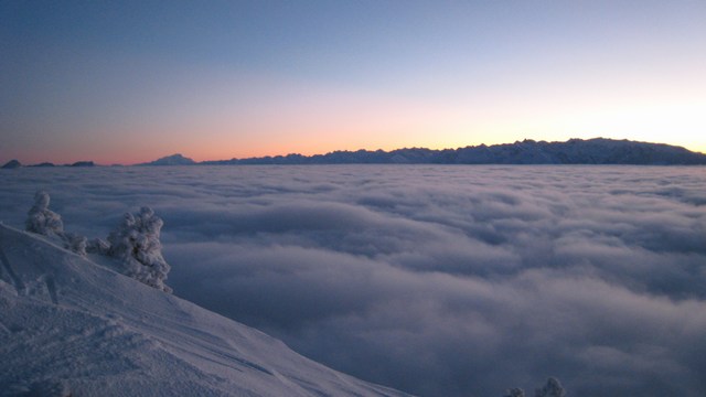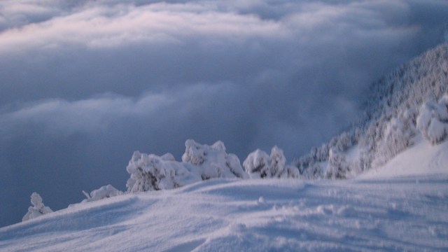 La face Est a subi les assauts du vent (certainement l'épisode de vent du Nord), le neige est irrégulière (carton,croute...) mais il n'y a pas de grosses accumulations, des plaques de neige rapportés glisse parfois sous les skis (~5cm)