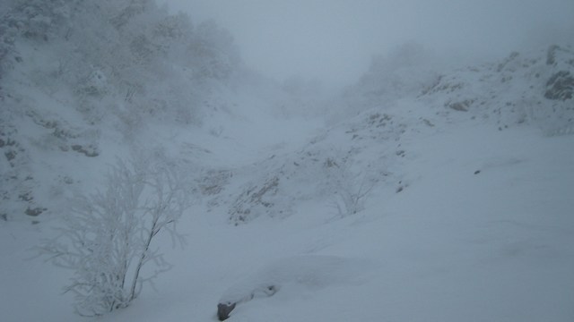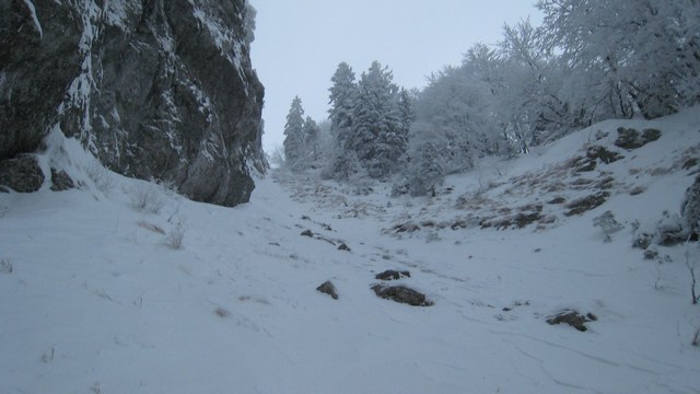 Au départ du parking je remarque qu'il y a beaucoup moins de neige qu'en Charteuse! Sympa cette face Est, bien pomatoire avec ce petit brouillard (1 remontée de 50m dans la face). Quelques touchettes mais je pense que la face est suffisamment bien remplie. Foret peu skiante car pas assez de neige. Le couloir derrière Château-Bouvier est vraiment ultra-sec. J'y retournerai pour deux raisons : skier plus sereinement sans avoir à ce soucier de l'itinéraire! Et pouvoir skier correctement la foret derrière Chateau-Bouvier (il faut plus de neige).