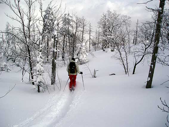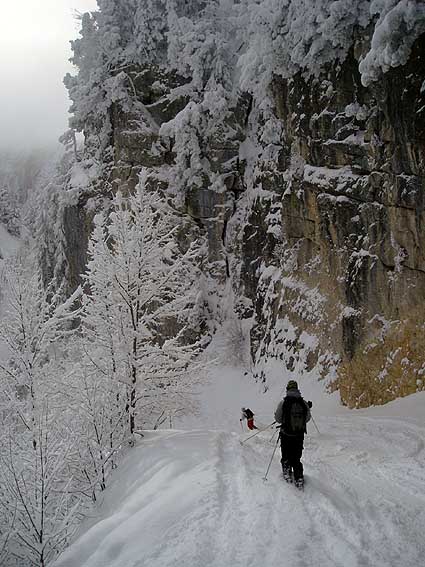 les talus se fissurent en plaques sous les skis. A noter un faible enneigement dans le couloir des Pucelles, bien attaqué par le vent.