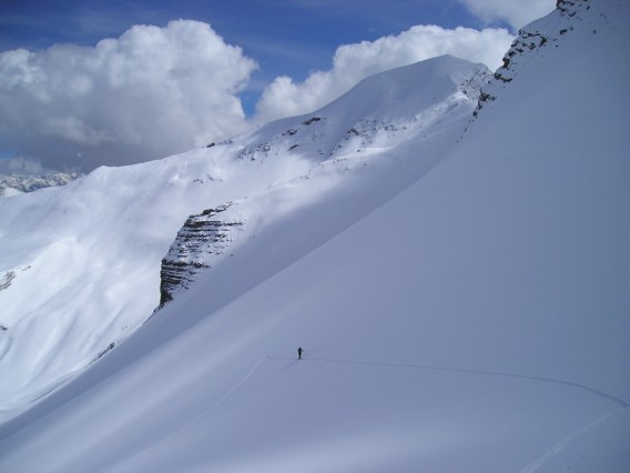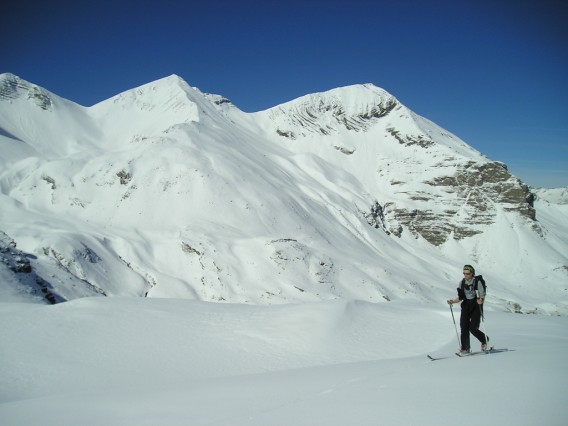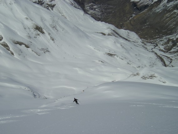 Une bien belle journée qui fait voir du pays. La boucle est longue mais la beauté des paysages et le caractère sauvage des lieux (seuls dans le vallon) font oublier le plat et le portage (45 min). Du bon ski dans l'ensemble, voire très bon >2500. Les portions croutées sont courtes et se négocient pas trop mal. Par contre, en descendant de l'homme sous le ressaut vers 2000 au dessus du saut du laire, la neige va bientôt manquer.