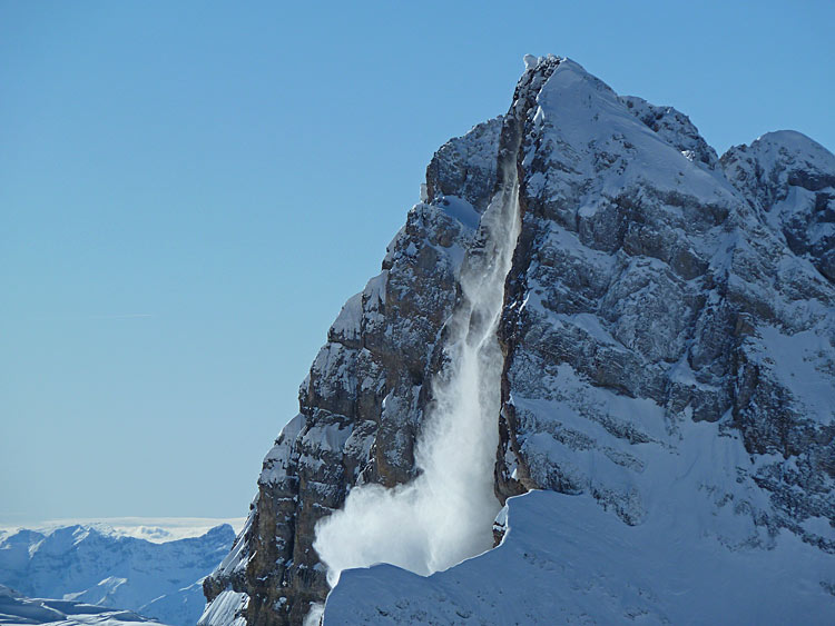 La dernière chute de 10 à 30cm (selon l'altitude) adhère moyennement sur le fond croûté ou transfo en versant ensoleillé d'où un peu d'activité avalancheuse au soleil sous les versant raides et les rochers. Idem pour les corniches qui sont bien prononcées et dont certaines dégageaient au soleil.