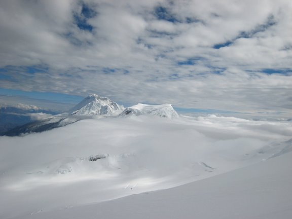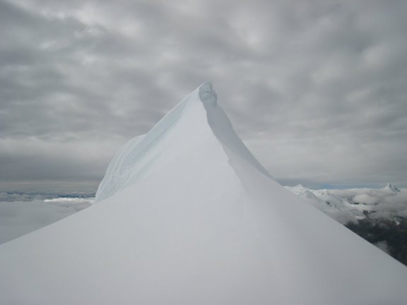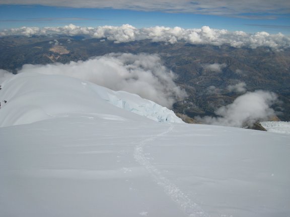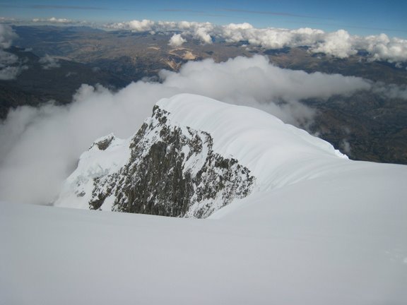 J2: Accès au couloir , puis remontée de celui-ci (200m à 40/45°). On prend pied sur le glacier du Copa. Remontée le long de l'arête Ouest pour éviter les trous. Une zone de sérac vers 5800m demande de la prudence (crevasse + zone raide). Sommet effilé et panoramique.