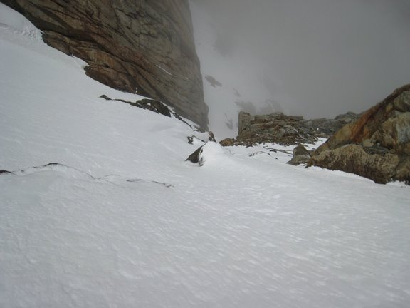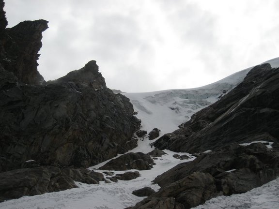 La météo de la nuit (pluie/neige) n'a pas suffit à me décourager , i compris l'approche délicate dans le pierrier dans la pénombre et le brouillard. Chaussage des crampons à 4950m avec une météo qui s'améliore et un regel quasi immédiat de la neige!