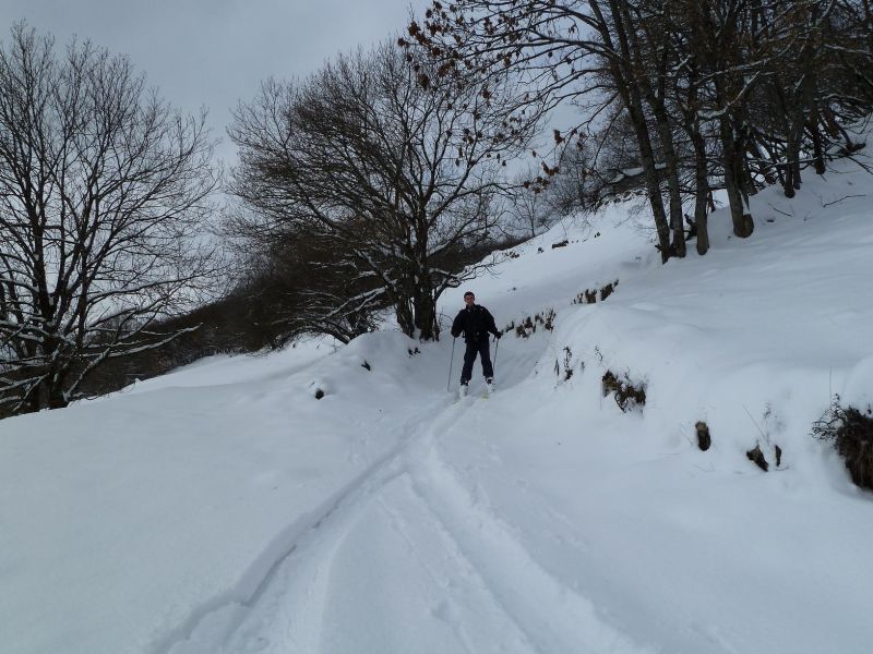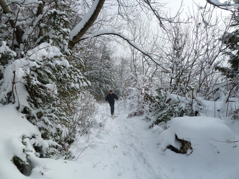 Jusque 800m : montée inférieure par le sentier d'été trop peu enneigé pour y descendre. Au retour, descente sur les bords de la piste plus large ramenant au village.