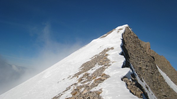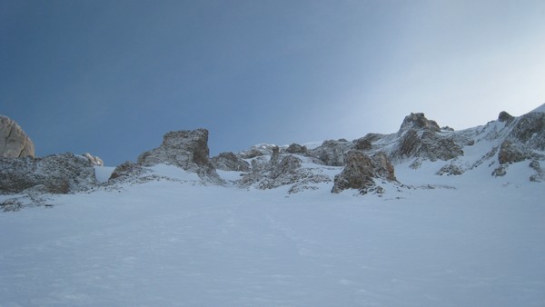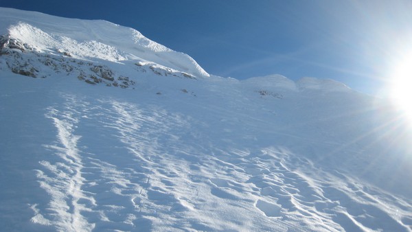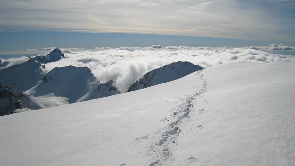 Au sommet du Rattier, j'ai été surpris par le Brouillard... J'ai bien fait de bien visualiser le passage dans la barre inférieur. La descente de la face Ouest est en très bonne condition, par contre le vent a fait des ravages dans les face Ouest du Devoluy...