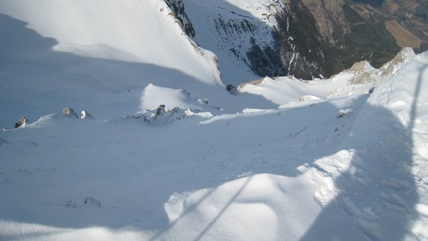 Quelle surprise en montant dans la face Nord avec cette qualité de neige! La face Nord est courte (300m) mais vraiment très raide (un bon 50° de moyenne sur 200m). Les parties les plus raides sont en grain fin. La corniche se passe bien.En tous cas la cotation (5.3) me semble justifié. Et quelle plaisir de skier le sommet de l'Obiou avec cette qualitée de neige! Même la neige au sommet est très bonne!