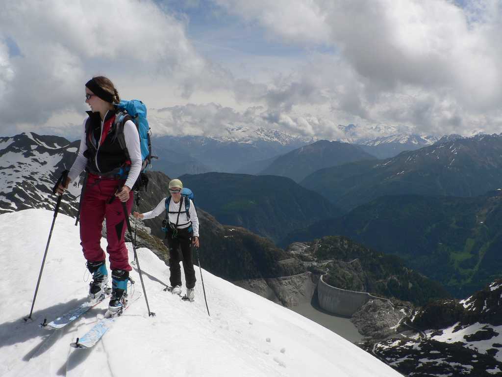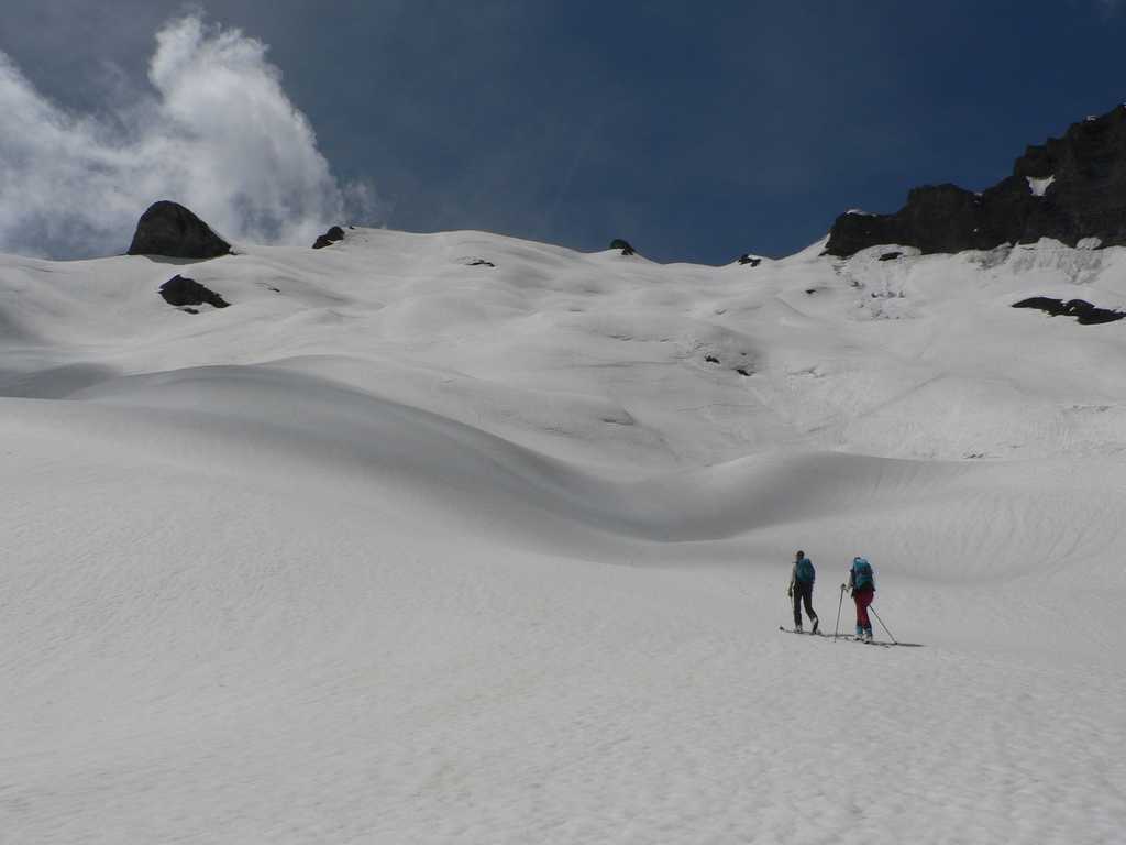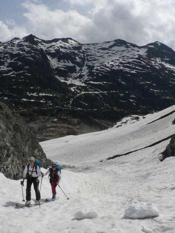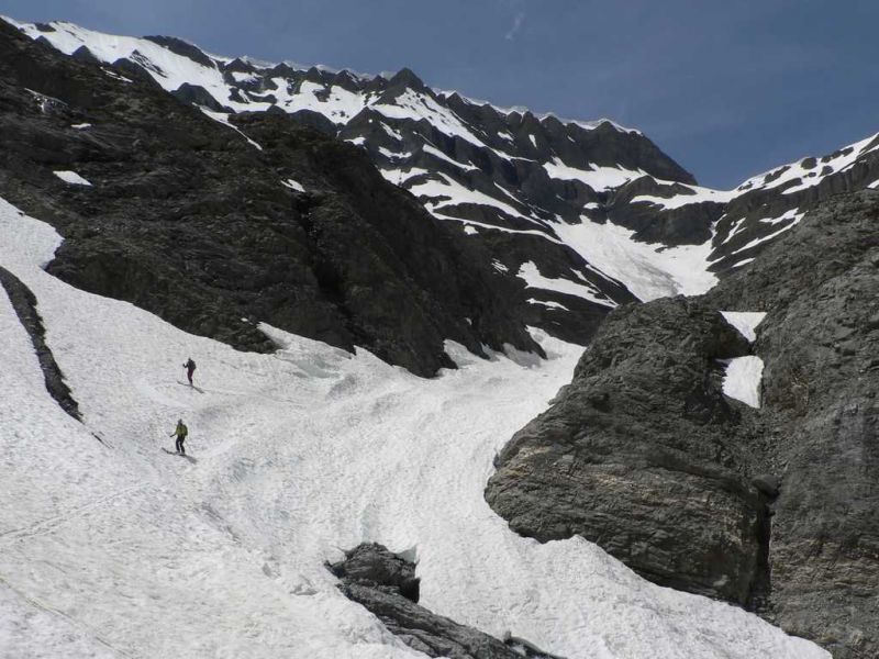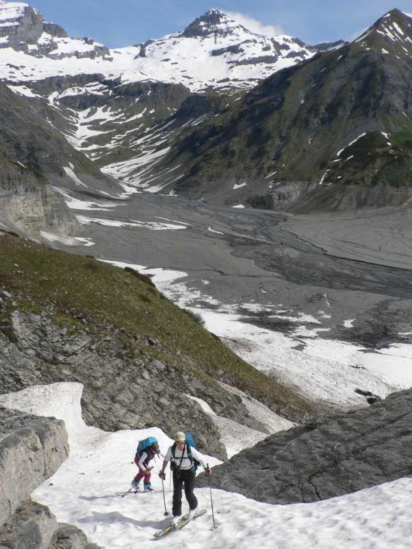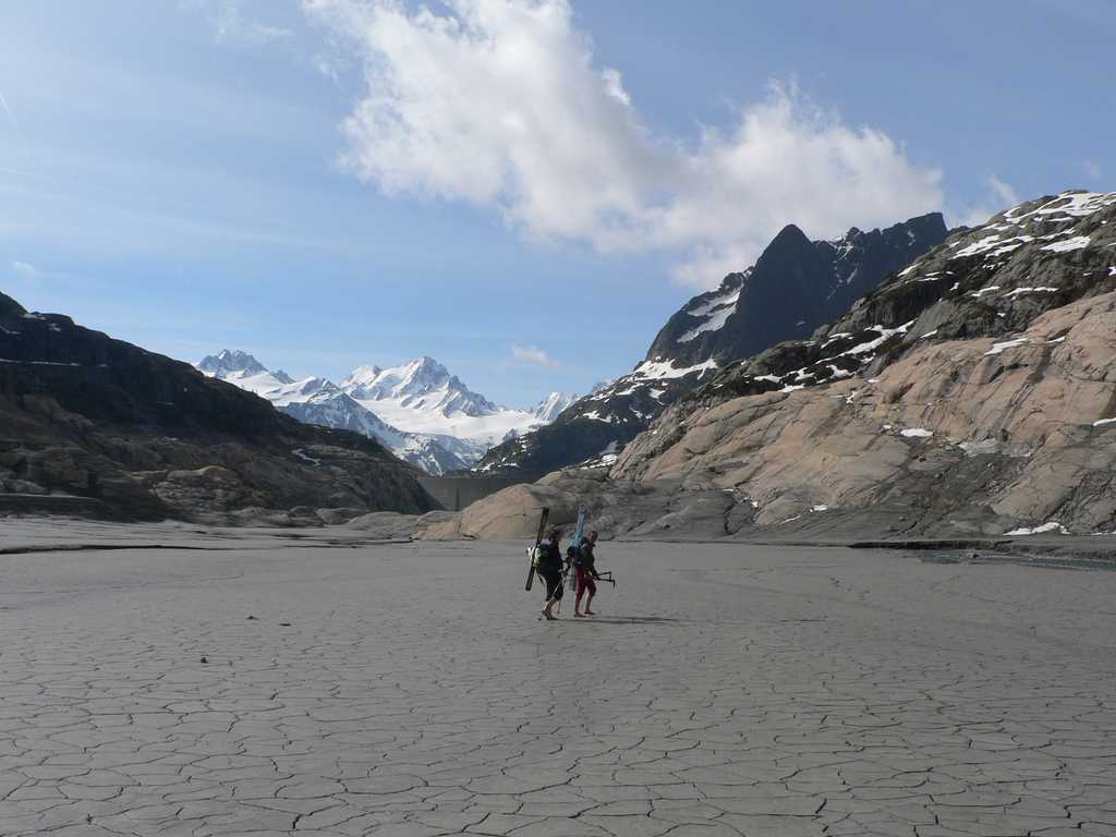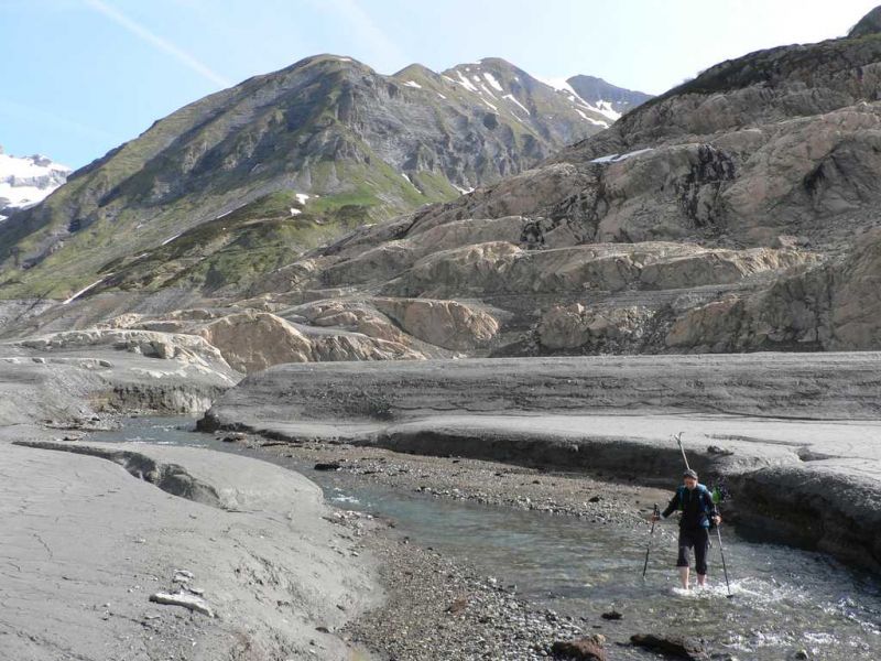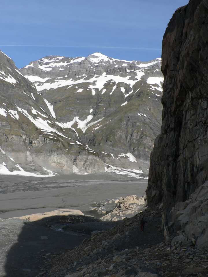C6 en AR. De la Gueulaz, route rive gauche du lac d'Emosson (qui est à sec en amont du barrage de Barberine. Descente dans le fond du lac d'Emosson peu avant les cabanes de pêcheurs situées sous la tête des Ottans. Montée par les gorges sous le glacier de la Finive qui sont bien bouchées par un grosse coulée.
