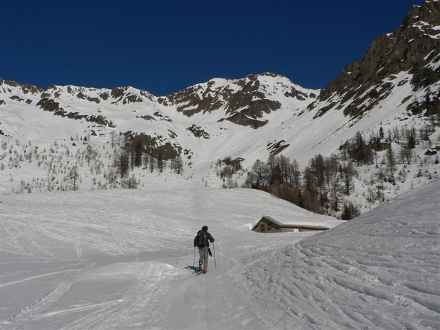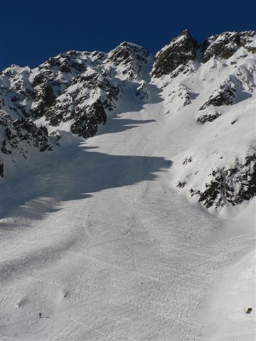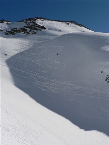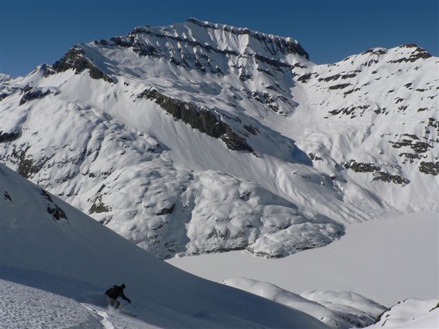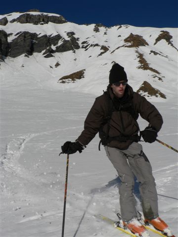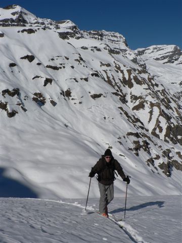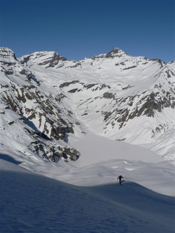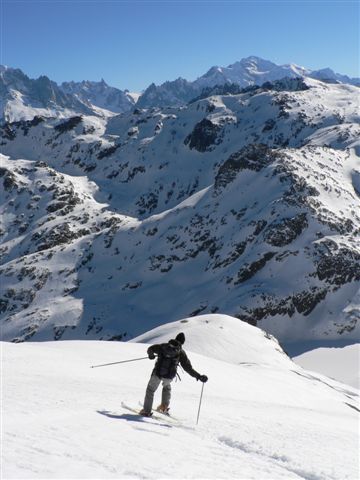 Magnifique journée de beau temps avec de la bonne neige (tantôt poudre, tantôt transfo) et des paysages dont on ne se lasse pas. Grand calme dans ce secteur (vu un compétiteur à l'entrainement dans la première montée puis plus personne). Merci à Emmanuel qui s'est prété au jeu du figurant et bravo puisqu'il a fait aujourd'hui son premier D+2000.