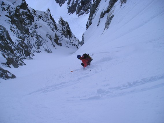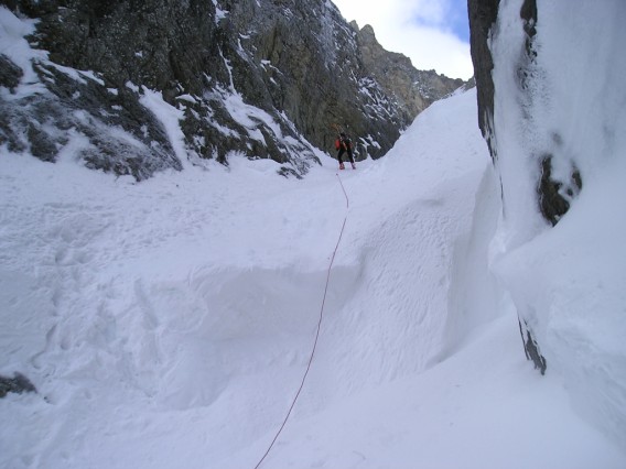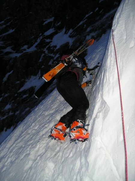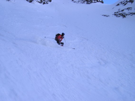 Superbe course dans une ambiance grandiose et surtout excellentes conditions de neige: montée efficace d'autant plus qu'une fine goulotte de 30cm de large rayait le couloir de bas en haut et permettait d'enfoncer à peine une demi chaussure. Descente sur une neige très régulière en surface et homogène de haut en bas avec peu de surprises mais le premier virage reste dur à déclencher...Ces bonnes conditions n'enlèvent rien au sérieux de l'entreprise