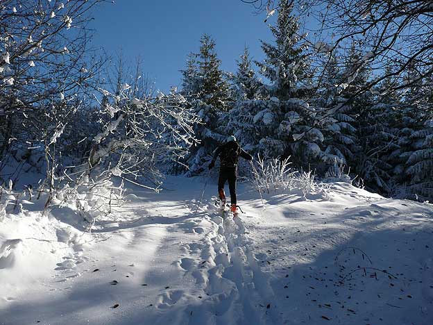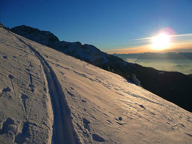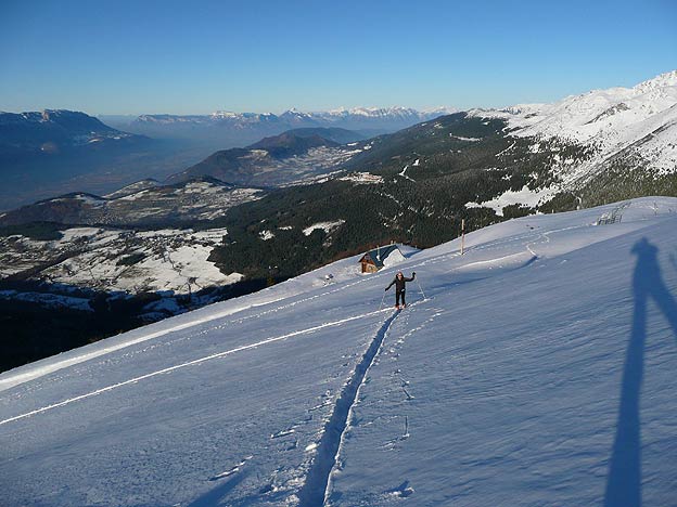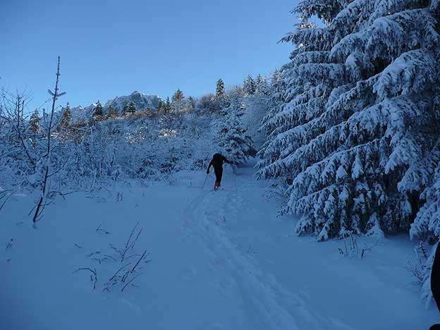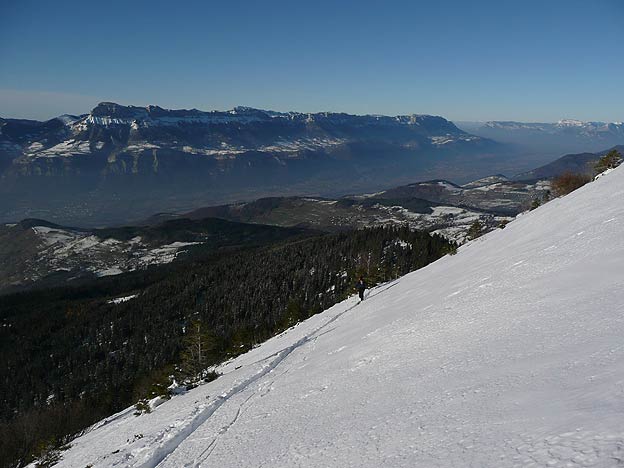 Nettement moins de neige qu'en Vercors mais très bonne neige, à peine humidifiée dans les pentes SW non empruntées sur cet itinéraire qui reste froid en hiver